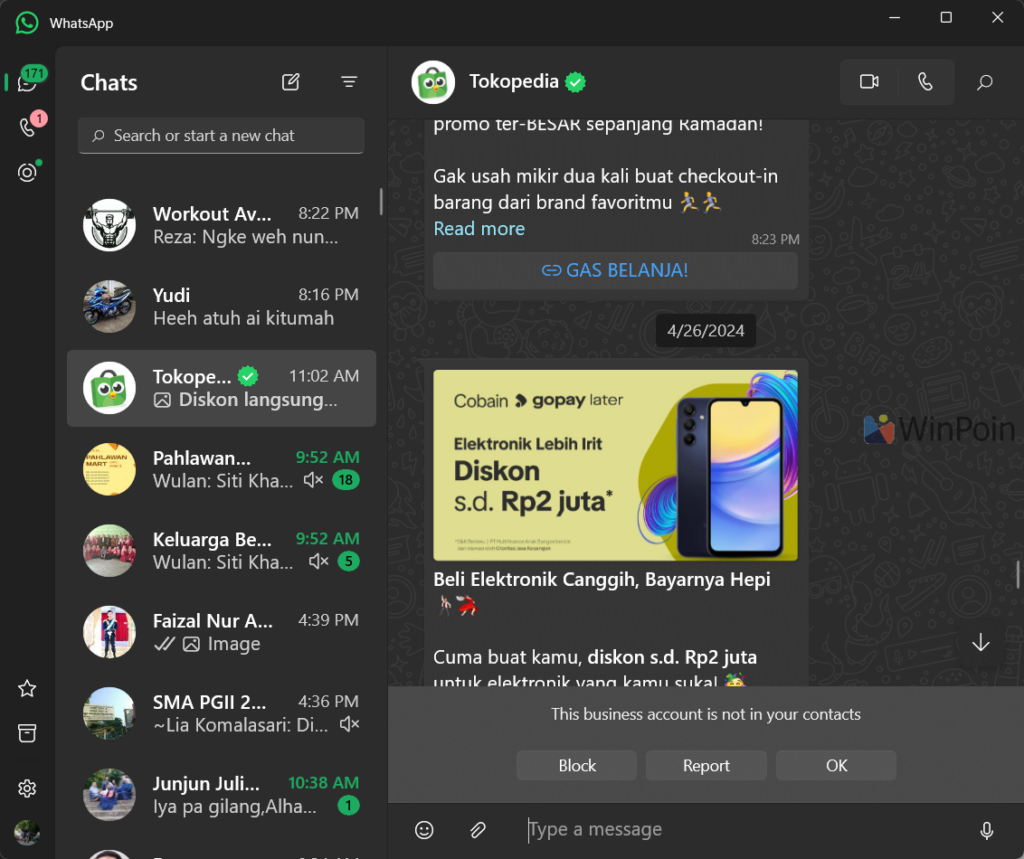 Jadi mari kita bahas perubahan pertama, Antarmuka pengguna adaptif Hal ini tentu menjadi hal yang sangat keren menurut saya, karena kini kita bisa mengatur ukuran jendela WhatsApp dengan lebih maksimal. Berbeda dengan sebelumnya yang tampil lebih besar tanpa memisahkan bagian-bagiannya obrolan utama Dan daftar obrolan seperti pada gambar berikut.